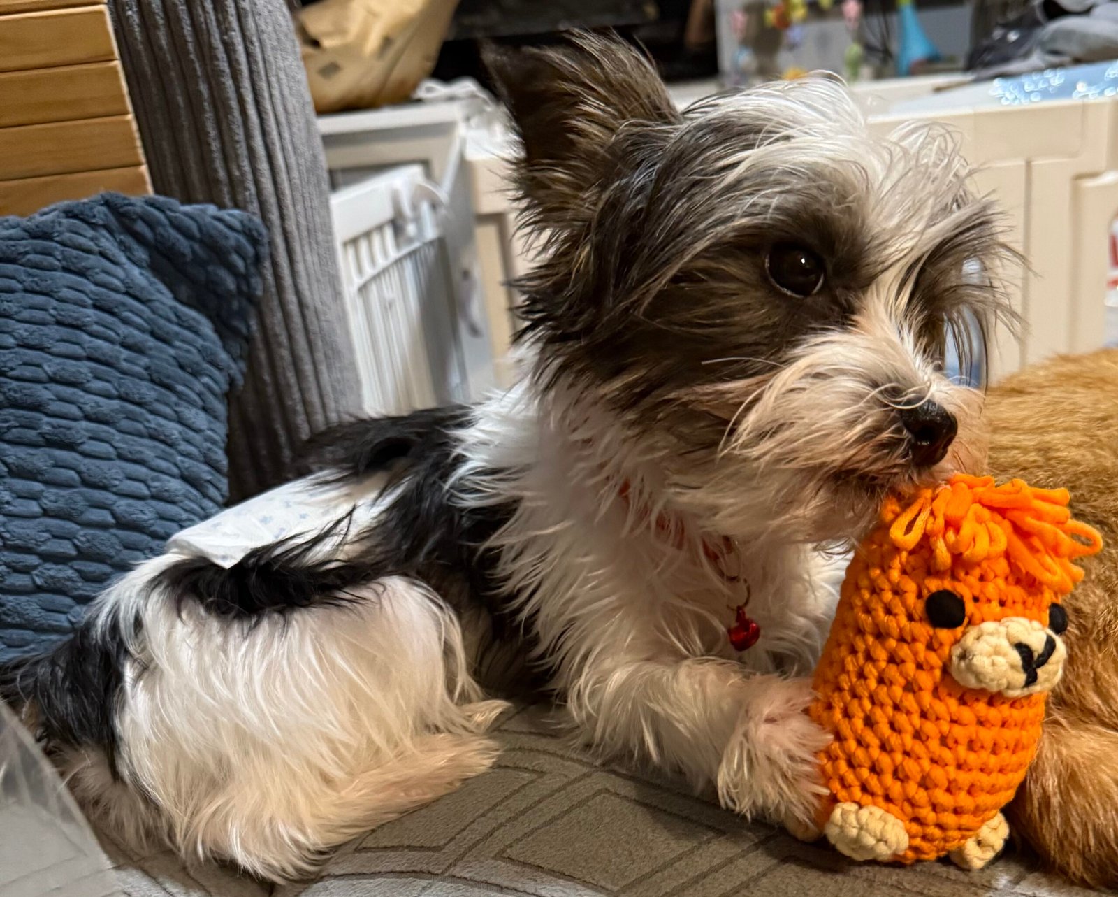 Dumpling is a sweet Chocolate Merle Yorkshire Terrier dam with the most gorgeous eyes. She loves nothing more than to curl up on your lap to take a nap. She has longer legs so when she isn’t napping she makes great leaps and zooms around chasing toys and friends.