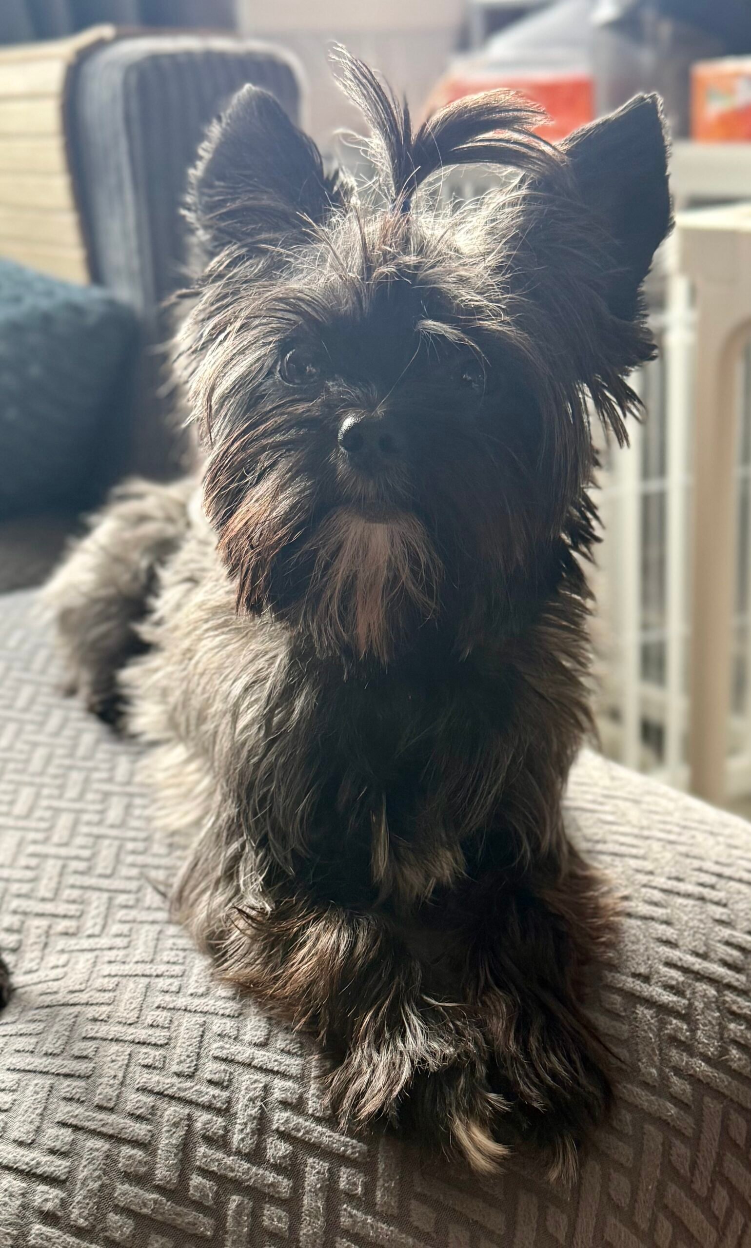 Maleficent is a KB black Yorkshire Terrier dam and carries chocolate and Parti. She is our dancing queen. Maleficent loves to stand on her hind legs and spin around, play with the little puppies and sit on her daddy’s lap while he works.