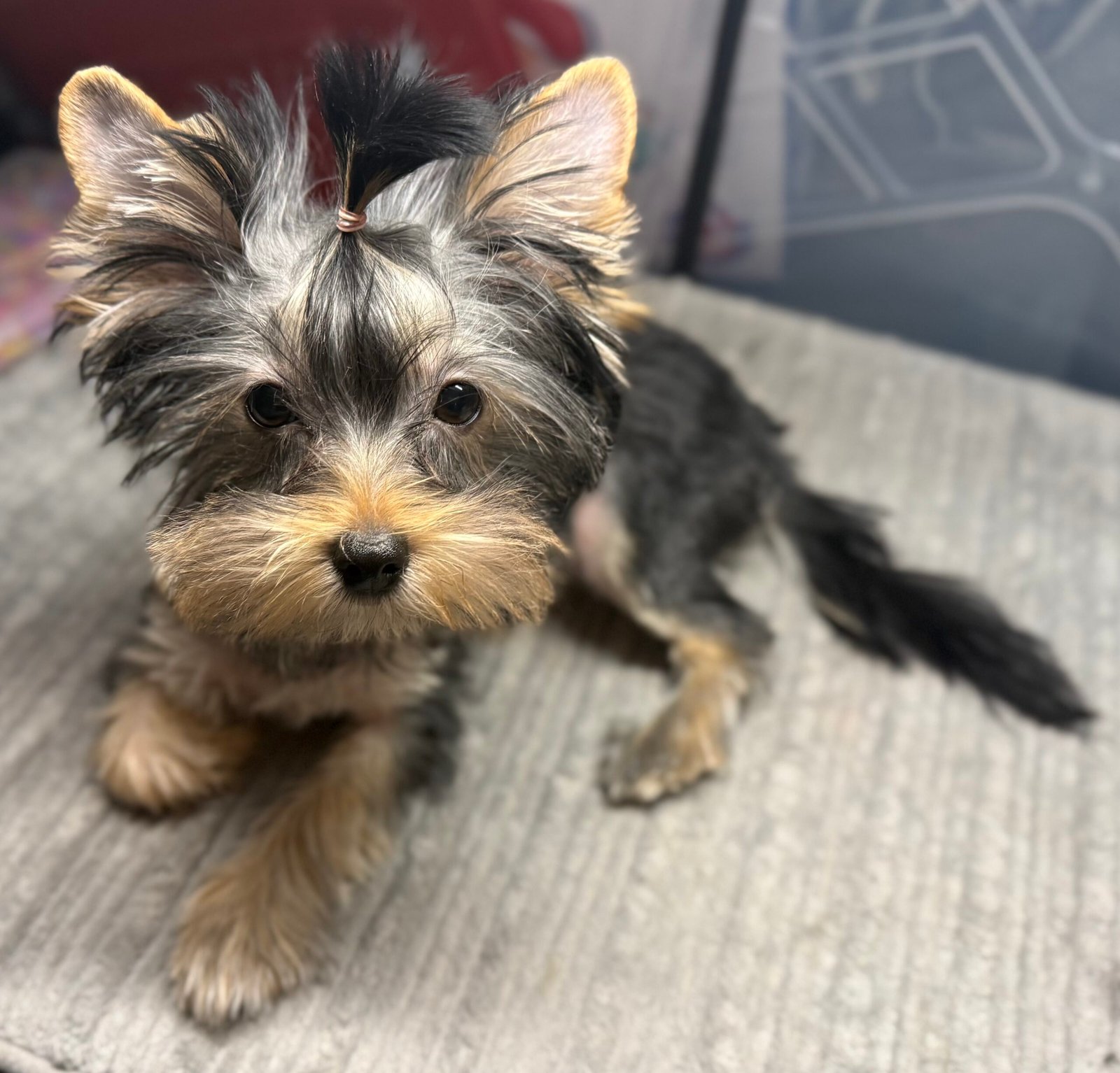 Bean is a KB black Yorkshire Terrier sire and carries dark face mask with the cutest button eyes. He is a shy guy with a heart of gold. He loves to play, give kisses and be chased around with a toy.