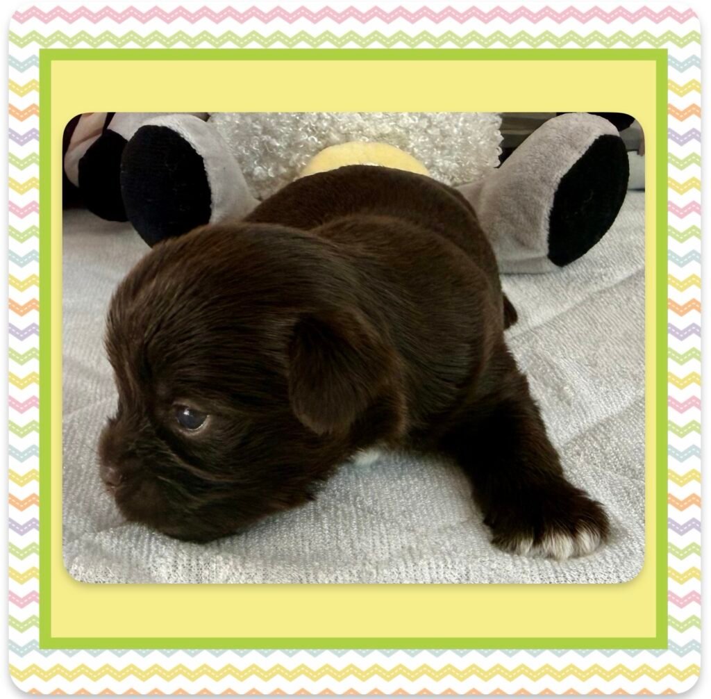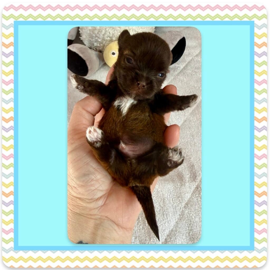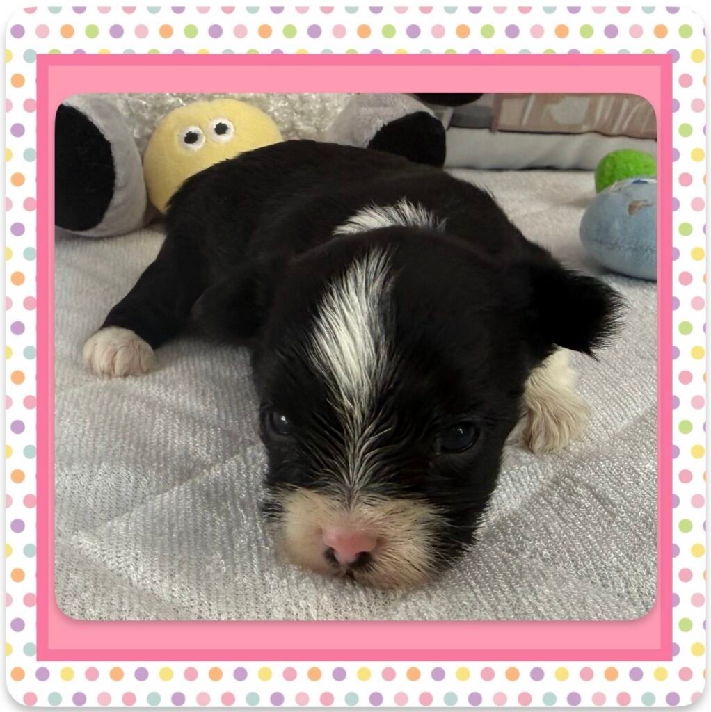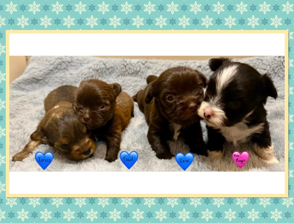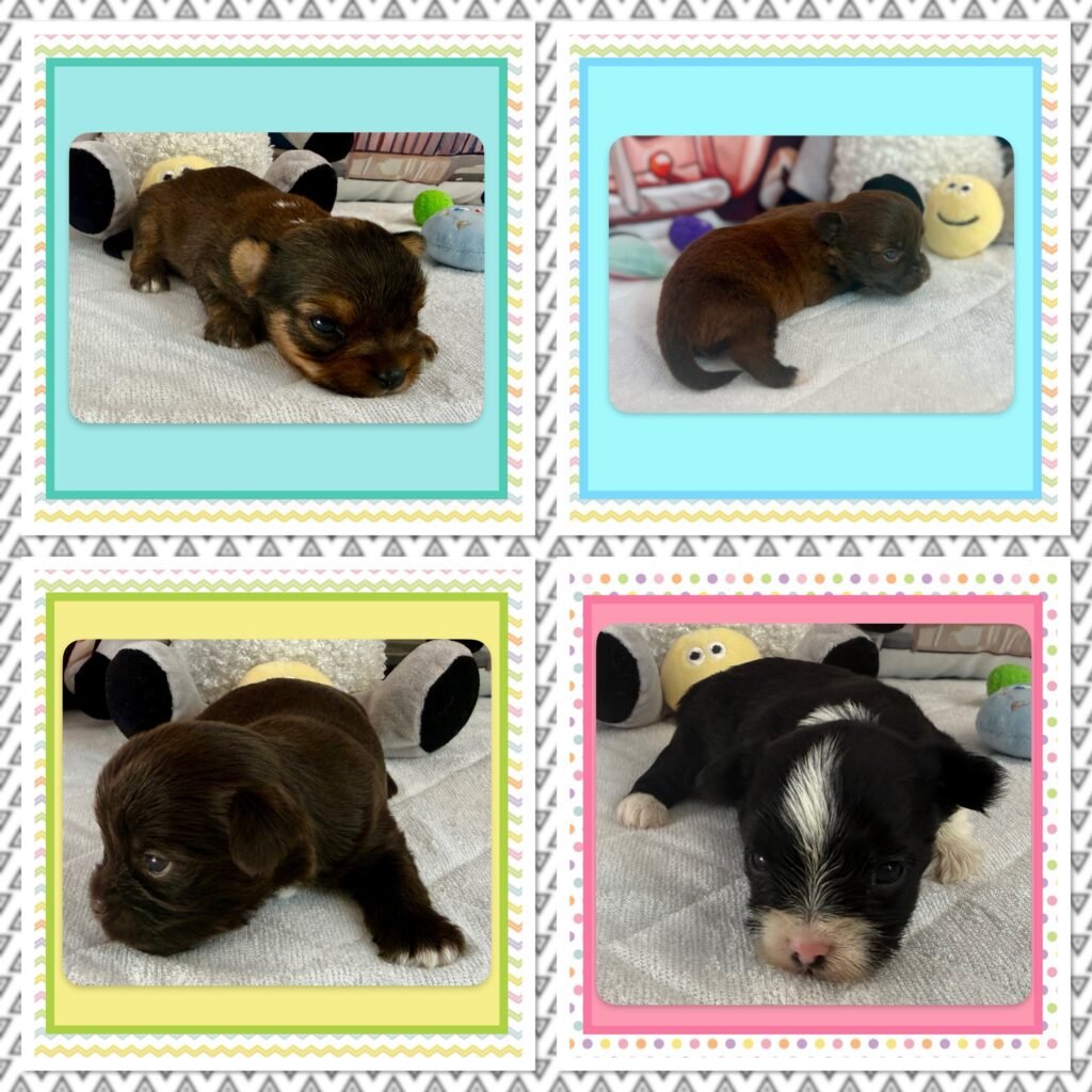 Four beautiful puppies 3 boys, 1 girl, were born to Bri and GusGus. They will have a go home date in March 2026. Colors will develop over the next few days but Xerxes is Sable Parti, Xolo is Chocolate Sable, Xane is Chocolate and Xia is KB Black Parti. .